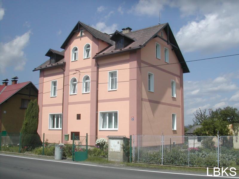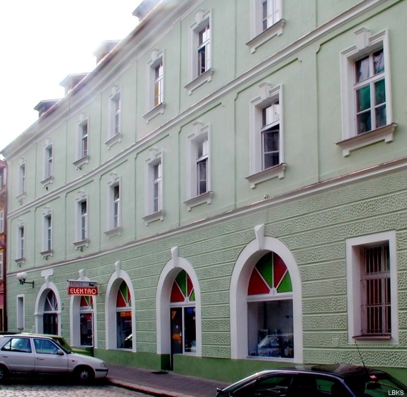 Fasáda po vyčištění s prvním nátěrem oranž.pruhu